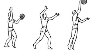 2. Согнутой левой рукой игрок держит мяч на уровне подбородка, т.е. нижней части лица. При этом правая рука поднята.