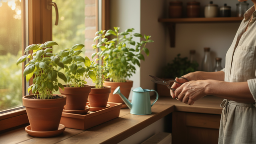 Утром включаю чайник, и первым делом иду к лестнице у кухонной двери. На каждой ступеньке свой горшок с зеленью, и ножницы лежат тут же, на нижней. Отрезал пару верхушек базилика, щепотку укропа для омлета, веточку мяты в чай — и дом уже пахнет по-летнему, даже если за окном зима и батареи потрескивают. Этот маленький «ступенчатый сад» мы собрали из обычной трехъярусной подставки и нескольких горшков по литру-полтора, и он оказался удобнее длинного подоконника: света всем хватает, листья не давят друг друга, а поливать и подрезать проще, так как каждый куст на виду...