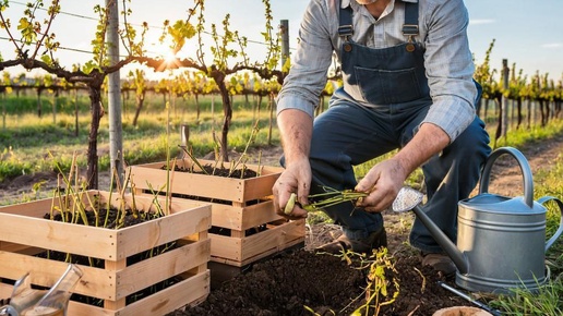 Как вырастить виноград из черенков? 🍇 Чтобы вырастить крепкий виноград из черенка — важно знать, когда и как его правильно подготовить и посадить. 1. Когда и как нарезать? Лучшее время — ноябрь–декабрь, после опадания листьев, но до сильных морозов. Берите вызревшую, коричневую лозу толщиной с карандаш — без трещин и пятен. Режьте на 3–4 почки: нижний срез под почкой, верхний — на 2–3 см выше. 2. Как проверить и замачивать? Осмотрите черенки — древесина должна быть зелёной и сочной. Для профилактики замочите на 30 минут в слабом растворе марганцовки...