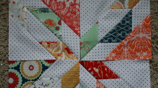 Для такого блока нужно взять квадрат размером 25,4 см и разрезать его по диагонали. Получившиеся треугольники накладываем друг на друга и отменяем 6,4 см от диагонали, как показано маленькой линейкой: Разрезаем по этой линии и параллельно по линии ниже тоже на расстоянии 6,4 см и получаем два меньших треугольника и две трапеции. Берём верхнюю длинную полосу и отменяем вдоль края 6,4 см: Разрезаем ткань, создав два ромба. Повторяем еще раз, отмерив еще 6,4 см от разреза, который только что сделали, и вырезаем еще два ромба...