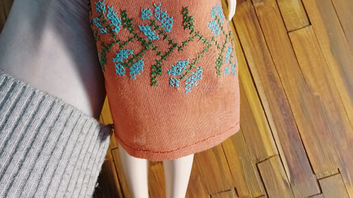 Здравствуйте мои читали. Пока я настраиваюсь на прошивку монстряшки Френки (ох уж эти волосы), решила, что нечего без дела сидеть. Был у меня где то небольшой кусочек оранжевого батиста , и захотелось сшить кукле платье. Нашла вот такую выкройку. Перенесла на ткань. Просто однотонное платье скучновато, хоть и такое яркое, решила немного вышить подол. Сначала я обычно вышиваю, потом уже вырезаю и шью. Крупноватые крестики получаются. В детстве мама покупала канву сетку, ее прикрепляешь к ткани, вышиваешь, а потом просто выдергиваешь ниточки...