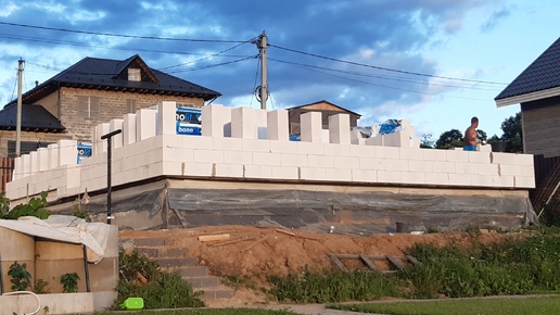 Возведение стен первого этажа из газобетона.