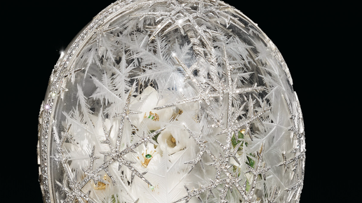 Сверкающие пальцы инея на хрустальной поверхности яйца прекрасны и настолько реалистичны, что кажется, будто оно холодное на ощупь. Яйцо покоится ледяном постаменте. Он почти бесформенный, словно его только что вытащили из замерзшей Невы, но каким-то образом он мягко и надёжно удерживает яйцо. Маленькие серебристые ручейки стекают по этому ледяному сталагмиту, словно приближается оттепель. Под матовыми фигурами, скрывающими прозрачную скорлупу, проглядывает что-то белое. Яйцо открывается, словно медальон, открывая свой секрет: подвесную корзину, полную лесных анемонов...