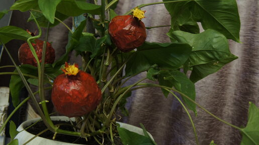 Купила комнатный гранат. А ждать, когда появятся красивые плоды еще года два-три. Так и родился мастер-класс. Пусть порадует глаз среди зелени,коей у меня уже горшков тридцать. Фольга, малярный скотч и акриловые краски. Ниточки и клей.Кисточки и чтоб было,куда воткнуть. Час удовольствия создания. Радость от того, что кто-то поверил такому обильному плодоношению филадендрона. Пожалуй,приступим. Начинкой граната может быть все,что угодно: старая газета, губка,тряпка,пластилин, клубок ниток,ногти,собираемые годами с ковра...