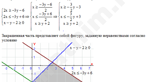 Построить фигуру, заданную неравенствами 2x≥−3y−6; 2x≤−3y+6; x−y−2≥0.