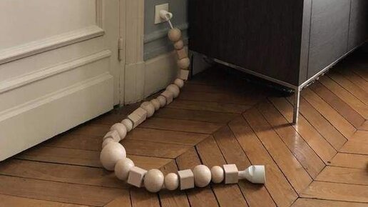 На мой взгляд, очень милая идея для маскировки проводов. Набираем необходимое количество декоративных элементов. Кубики, кстати, можно напилить самостоятельно из брусков разной толщины. Берём сверло, соответствующее диаметру провода, и в каждом элементе просверливаем отверстие...