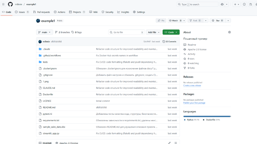 Привет! Вы решили создать свое первое серьезное приложение для анализа данных на Streamlit и для этого смотрите на GitHub. Отличный выбор! Это стандарт индустрии и лучший друг разработчика. Давайте используем ваш скриншот как карту и разберемся, что здесь к чему. То, что вы видите на скриншоте — это главный экран репозитория. Слева мы видим список файлов и папок в проекте. Давайте посмотрим на самые важные для вашего будущего Streamlit-приложения: Теперь посмотрим на вкладки вверху. Это ваша панель управления проектом...