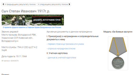 Не путайте с сайтом Память народа – он практически копирует данные с сайта ОБД-Мемориал, поэтому на нем останавливаться не буду. А вот Подвиг народа – это немного о другом… есть тут такая строка – Люди и награждения. Вот нам туда Забиваем в поисковую строку имя нашего героя, в моем случае – все тот же Сыч Степан Иванович (это мой дед по отцовской линии) и смотрим результаты...