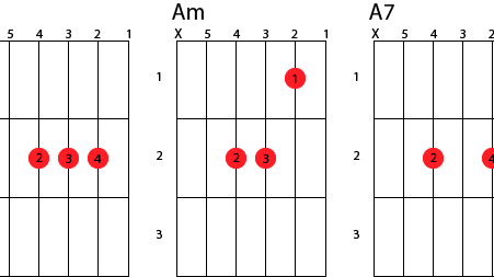 A, Am, A7 B, Bm, B7 C, Cm, C7 D, Dm, D7 E, Em, E7 F, Fm, F7 На схемах F, Fm, F7 изображён приём баррэ. Как научиться его использовать? Суть в том, что указательным пальцем зажимаются все 6 струн. Палец выступает как бы в роли верхнего порожка. Существуют разные варианты исполнения этого приема. Большое баррэ – все струны зажимаются одним пальцем, малое баррэ – зажимается лишь несколько струн...