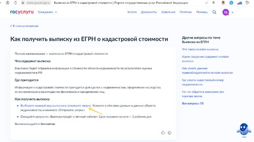 Как узнать кадастровую стоимость в режиме online я рассказывала в предыдущей статье. Сейчас расскажу подробно как заказать выписку о кадастровой стоимости на сайте Госуслуги. Проходим по ссылке https://www.gosuslugi.ru/help/faq/egrn/101777 Далее видим такое окошко. Здесь нужно будет перейти по ссылке «Выберите нужный вид выписки и заполните запрос». Далее жмем на кнопку «Начать» Выпираем «Получить выписку из ЕГРН Выбираем «Кадастровая стоимость» Как видите это выписка бесплатная Затем выбираем из списка кем являетесь – «Правообладателем», например...