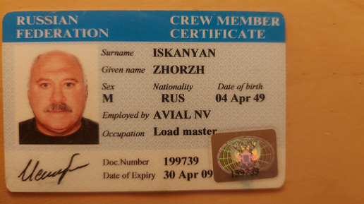 Исканян Жорж После того, как мы стали летать заграницу, наш международный отдел выдал всем членам экипажей международные пропуска бейджики. Их можно было повесить на шею, а можно просто прикрепить к карману маленькой прищепочкой. На лицевой стороне пропуска красовалась физиономия его владельца и указывалось на английском языке, что этот мужик не какой-нибудь шалопай, а член экипажа Российской авиакомпании летающий в соответствующей должности. С этим "аусвайсом" (как его многие называли) все двери аэропортов в нашей стране и за рубежом были открыты...