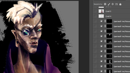 Для чего может понадобиться навык покраса чёрно-белой картинки? Первое, что приходит в голову- реставрация старых фотографий или их реконструкция. Представить, как могли выглядеть события начала 20 века в цвете- вполне себе любопытный опыт. Как это работает, покажу на примере отрисовки персонажа. Сначала покрасим арт с помощью корректирующих слоёв. Этот способ, по-моему, самый простой и гибкий. Ещё до покраса отрисую лайн на новом слое поверх фотографии эскиза и добавлю нейтральный серый фоновый слой под лайн...