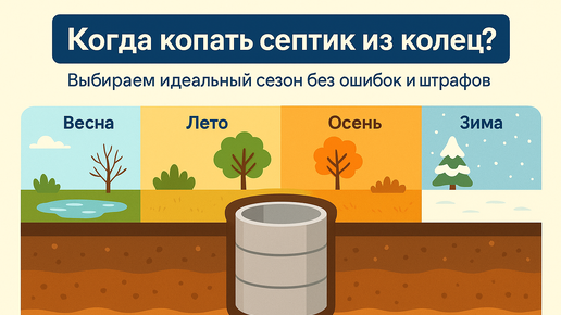 Бетонные кольца — классика. На них выросли тысячи «народных» септиков, и у каждого дачника есть знакомый, который «сам всё выкопал и поставил». Только вот один нюанс: не в любое время года эти кольца можно копать. И не везде. Разберёмся, когда копать септик из колец действительно можно, а когда — не стоит даже начинать. Весной земля насыщена влагой, уровень грунтовых вод высокий. В это время копать котлован — значит напороться на воду уже на первом метре. Кольца встанут в грязь, их зальёт грунтовыми водами, и вместо септика получится «вечная лужа»...