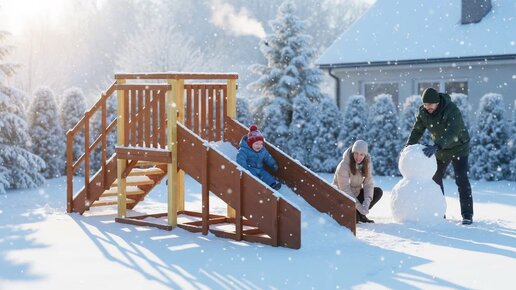 Правильная заливка превращает деревянную конструкцию в настоящую ледяную трассу, на которой дети катаются часами, а родители наслаждаются красивым двором без лишних хлопот. Перед заливкой очистите горку от снега, наледи и мусора. Проверьте, чтобы все крепления были надёжно затянуты, а поверхность сухая. 🔹 Проверьте щели и стыки — заделайте их снегом, чтобы вода не уходила внутрь конструкции.