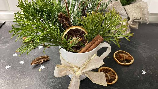 Даже самая простая кружка, дополненная хвойными веточками и новогодним декором, будет смотреться красиво и небанально. Приятный подарок и знак внимания! Оформлять – одно удовольствие, а уж дарить такую композицию – тем более! Элементы композиции Для оформления такого подарка вам понадобятся: Порядок действий 1) Нарежьте нечетное количество веточек длиной от 20 до 30 см. Лучше всего использовать можжевельник, тую, пихту благородную (нобилис) или сосну. Хвоя на ветках этих растений слабо подвержена осыпанию, а выглядят они не менее эффектно, чем еловые...