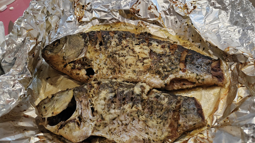 Перепали нам караси, которые были пойманы в Астрахани) Ну, и сразу же свеженьких решили и запечь в духовке под сметанным соусом. Делается это быстро, а получается очень вкусно) Для начала чистим, убираем внутренности и делаем надрезы вот так сверху карасей, чтобы было меньше мелких костей при готовке. Скажу сразу, что мелкие кости конечно были, но их было не так много. Выкладываем карасей на фольгу, посыпаем любимыми специями. Мы взяли соль, чёрный перец, майоран, петрушку, розмарин, тимьян...