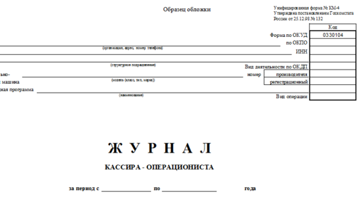 Зачем нужна и у кого должна быть книга кассира-операциониста (форма КМ-4) Журнал кассира-операциониста утвержден постановлением Госкомитета статистики от 25.12.1998 № 132 (далее — постановление № 132), его также называют унифицированной формой КМ-4. Обязанность ведения журнала при применении ККМ закреплена в типовых правилах, содержащихся в письме Минфина от 30.08.1993 № 104. Но эти правила утратили актуальность в связи с принятием новых норм законодательства об использовании ККМ — прежде всего, положений закона от 22...