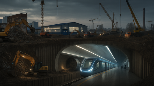 Художественный нейро-арт коллаж Вчера — завод игрушек, сегодня — будущая станция метро На этих фотографиях — момент, который ещё недавно казался фантастикой для жителей Бирюлёва и Царицыно. На месте корпусов легендарного завода игрушек «Огонёк» уже работает тяжёлая техника, а в грязных лужах будущей стройплощадки отражаются стрелы кранов и экскаваторы. Идёт подготовка котлована станции «Каспийская» новой Бирюлёвской линии метро: бетоном заливают пионерные траншеи под стену в грунте, одновременно продолжается вывоз строительного мусора и остатков цехов бывшего завода...