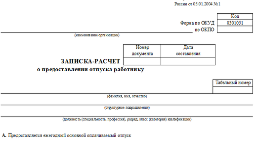 Записка-расчет о предоставлении отпуска работнику по форме Т-60