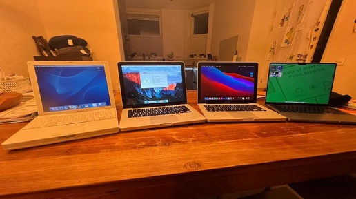 Такой домовитости и рачительности мы можем только позавидовать. На форуме Reddit кто-то показывает эволюцию своей домашней линейки компьютеров Apple с 2003 по 2025 годы. Она включила в себя iBook G4 2003 года, MacBook Core 2 Duo 2008 года, MacBook Pro 13" 2011 года (а вот 15-дюймовая модель скорее всего померла бы) и закрывает серию M1 Max. Автор признается, что были вкраплениями еще разные iMac и даже Mac mini Server, но эти машины стали его основными инструментами на прошедшие 20 лет...