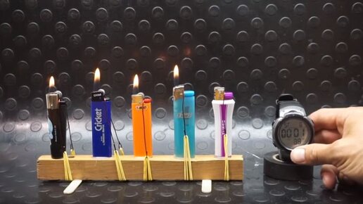 Для теста мы отобрали зажигалки нескольких фирм. Это Cricket, Clipper, Bic, Lion и Turbo. Сначала необходимо их закрепить. Используем для этого обычный деревянный брусок и клей. Также на брусок продеваем проволочки с резинкой. Они нужна для того, чтобы зафиксировать кнопку выпуска газа на каждой зажигалке. Получился вот такой стенд для испытаний. Теперь поочередно зажигаем огонь и включаем таймер. Время пошло! Может показаться, что последняя зажигалка не горит. Но на самом деле это турбозажигалка, а огонь в ней почти незаметен...