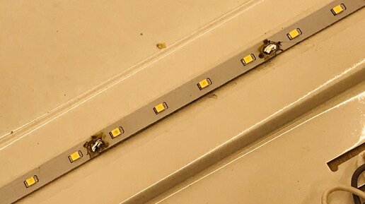 Добрый день. Светодиодные светильники в данный момент получили повсеместное распространение. В данной статье я опишу метод ремонта светильника в потолок типа "Армстронг", но в целом метод рабочий и для других светильников тоже. Снимаем светильник, открываем корпус. Необходимо подготовить кусок кабеля с вилкой, чтобы найти перегоревший блок светодиодов. В данных светильниках светодиоды включены в цепь последовательно блоками по 4 шт. На фотографии выше видно, как затемнены 2 блока. Иногда так явно не видно, покажу, как их найти...