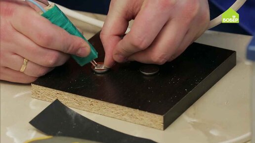 Если вам нужно скрепить небольшие детали, такой аппарат отлично подойдёт! С помощью ножовки сделайте пазы с двух сторон деревянного бруска. Аккуратно зачистите провод, не повредив жилы: снимите верхнюю изоляцию и зачистите концы примерно на 2,5 см. Прикрутите провода с помощью скрутки к медным жилам. С помощью кусачек загните концы, чтобы проволока не размоталась. Уложите проволоку в пазы бруска таким образом, чтобы 5-7 мм выходило за его пределы. Плотно примотайте провода к бруску при помощи изоленты...