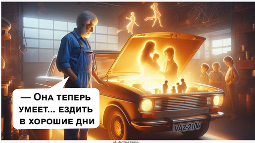 📘 Канал "Бытовые Байки" представляет: Что делать, если ваш механик случайно превратил старенькую "шестёрку" в машину времени? Особенно когда выясняется, что она умеет возвращаться только в те дни, когда вы были счастливы... — Серёга, ну что там с моей ласточкой? — Виктор Семёнович заглянул в гараж, где его ВАЗ-2106 1985 года выпуска лежала на подъёмнике, как пациент на операционном столе. Сергей Кузькин, механик с тридцатилетним стажем и привычкой разговаривать с машинами, даже не обернулся: — Говорю же, Витёк, твоя красавица просит нежности...