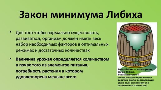 Или ЗАКОН МИНИМУМА ЛИБИХА, "Закон ограничивающего фактора". Интересно, что закон этот, сформулированный немецким химиком Юстусом фон Либихом, активно и очень охотно применяют экологи. Звучит он так: наиболее значим для организма тот фактор, который более всего отклоняется от оптимального его значения. Причём же тут бочка, просите вы? А вот как раз бочка (но не цельнолитая или сварная, а созданная по древней технологии, из отдельных дощечек) очень наглядно демонстрирует сказанное Либихом. Грубо говоря,...