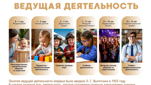 Каждый этап взросления ребенка — это особенный период, в котором есть главная или правильно сказать «ведущая деятельность», определяющая его развитие. Понятие ведущей деятельности впервые было введено Л. С. Выготским в 1933 году. Оно встречается в его заметках-конспектах к лекциям по психологии дошкольников, а также в лекции «Игра и её роль в психическом развитии ребенка», прочитанной в Ленинградском педагогическом институте им. Герцена. В дальнейшем это понятие получило развитие в работах таких учёных, как Л...