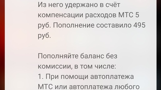 Оплатила телефон оператору МТС. И пришло такое письмо про компенсацию. Это что за 5 руб. ? Такого ещё не было. Обычно компенсацию начисляю в том случае, если появились какие-то дополнительные расходы. Такие, которых прежде не было. В данном же случае, вообще непонятно, почему мы должны оплачивать что-то дополнительно, ведь никаких пояснений от оператора нет. И не предвидится. Хотя известно, что не так давно МТС открыли свой банк. Со всеми вытекающими отсюда функциями и возможностями. Получается, что бизнес теперь может вот вешать на потребителей свои издержки или долги...
