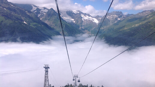 Погода в горах переменчива. И как бы нам ни хотелось тщательно спланировать отпуск, дождь может внести свои коррективы. Но если вы проснулись и обнаружили затянутые тучами горы, не расстраивайтесь. А приступайте к плану Б. Что же делать в дождь в Домбае? Вариант не 100%. Есть риск, что горы останутся спрятанными. Но возможно, непогода останется внизу, а наверху вас будут ждать ясное небо и шикарные виды. Всё зависит от того, насколько низко висят облака. Вы только посмотрите! А ведь это всего лишь подъём на первый уровень...