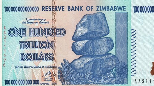 Самый наибольший номинал имела купюра Зимбабвийский доллар. Купюра номиналов в 100 триллионов долларов. Причина существования купюр такого высокого номинала – сумасшедшая инфляция в стране. Если же оперировать конкретными цифрами, то она составила 231 млн процентов за год. На сегодняшний день данная валюта в Зимбабве уже не ходит. Экономика Зимбабве пережила не самые лучшие моменты за всю историю государства. После череды небывалой инфляции, в 2008 году она достигла настолько колоссальных размеров, что банкноты номиналом от 1 до 25 миллионов долларов Зимбабве — обесценились...