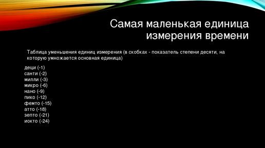 Учёные измерили самую короткую единицу времени: срок, за который лёгкая частица пересекает молекулу водорода. Итак, самое короткое в мире явление длится 247 зептосекунд. Зептосекунда — это одна триллионная миллиардной секунды или десятичная точка, за которой следуют 20 нулей и единица.