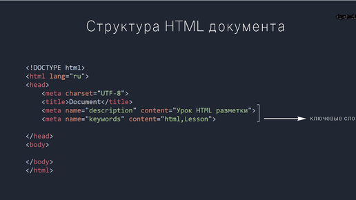 Первое, с чего мы начнем, будет знакомство c HTML. Итак, структура HTML-документа начинается с тега - ---------------<!DOCTYPE html> - тип документа, необходим для браузеров, чтобы они понимали какой тип документа перед ними находится и как его нужно отображать в браузерном окне. ---------------<html lang="en"> - обозначает на каком языке данный сайт будет отображать контент, в данном случае ("en") на английском, а если ("ru" ) - русский, и так далее. ---------------<head></head> - голова, содержит...