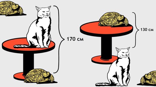 Китайская задача про стол, кота, черепаху и взрыв мозга. Вот задачка, от которой перегревается процессор у многих взрослых. Хотя всю задачу можно описать одной картинкой: Какой высоты стол? Решение Может показаться, что эта задача не имеет решения: мы не знаем ничего о размерах кота и черепахи, только разницу в высоте. Но так ли это на самом деле? Обозначим высоту стола за С, черепахи — Ч, а кота — К. Теперь запишем то, что на картинках, в виде математических формул. На первой картинке кот сидит...