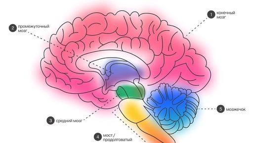 Различают пять отделов головного мозга: продолговатый мозг с мостом, мозжечок, средний мозг, промежуточный и конечный (большие полушария). Продолговатый, средний и промежуточный мозг вместе образуют ствол головного мозга. К нему крепятся мозжечок и большие полушария. Каждый из отделов содержит скопления нейронов — центры, отвечающие за определённые функции. Для выполнения этих функций и связывания отделов между собой клетки мозга выделяют специальные химические вещества — нейромедиаторы...