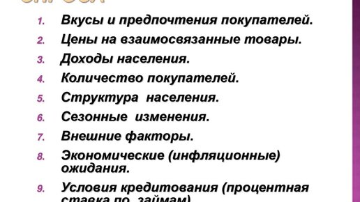 Неценовые факторы спроса Факторы влияния на спрос: · Цена · Доход граждан · Реклама · Мода · Структура населения · Цены на другие товар · Экономическая политика правительства · Эффект замещения · Сезон Спрос – готовность, желание и возможность покупателя приобретать товар и услугу. Величина спроса – отражает, то количество товара, которое было куплено по одной цене за определенный период. Закон предложения – предложение растет с увеличением цен и падает при снижении или при прочих равных условиях по высоким ценам продавцы предложат больше товара, чем по низким ценам...