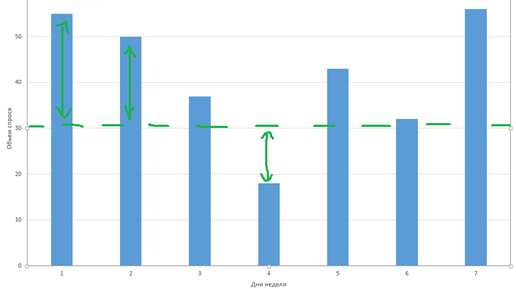 Величина страхового запаса зависит от многих факторов. Понимание этих закономерностей дает возможность снизить страховой запас и, как следствие, снизить расходы компании. Выделим основные факторы: Вариативность Наиболее значимым из факторов является вариативность объема спроса. Она проиллюстрирована на рисунке ниже. Синим цветом выделены продажи по дням недели. Зная их, мы можем посчитать средние продажи за день (горизонтальная пунктирная линия) и отклонение от них. Чем выше отклонение, тем больше будет вариативность...