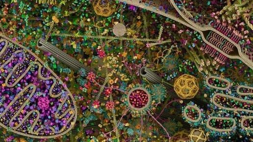 На фото – подробная модель клетки человека. Похоже на волшебный город! Или шкатулку, полную причудливых драгоценностей. Модель создали два ученых - Эвен Ингерсолл и Гаэль Макгилл. Они сконструировали составное изображение, на котором наложены данные рентгеновской, магнитно-резонансной и криоэлектронной микроскопии. Это эукариотическая клетка – то есть клетка с ядром, внутри которого находится ДНК. Не все человеческие клетки содержат ядро. Например, ядра нет у клеток крови - эритроцитов. Слева на фото – крупный объект сиреневого цвета – это митохондрия...