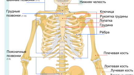 Скелет взрослого человека состоит из около 206 —208 костей: 23 костей образуют череп, 33 — позвоночный столб, 25 — ребра и грудину, 64 — скелет верхних конечностей, 62 — скелет нижних конечностей. B скобках приведены латинские названия, число в скобках указывает на количество одинаковых костей. Скелет человека (вид спереди) Скелет человека (вид сзади) Строение черепа человека (вид сбоку) Вид спереди Череп (cranium) состоит из 23 костей. Кости среднего уха (3×2): Позвоночный столб (columna vertebralis)...