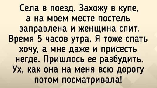 Не имеет значения — в купе ли, в плацкарте — поезда всегда найдут, чем удивить. То полку нижнюю займут без спроса, то ночью кто-нибудь место перепутает и на вас сядет, а то и хрупкая девушка окажется в вагоне полном вахтовиков. Ехали с парнем в поезде. Он уже спал, а я есть очень хотела. На какой-то станции вышла за едой. В поезд буквально залетала, он уже тронулся. Зашла в купе, в темноте поцеловала парня со словами: «Доброй ночи, котик», — залезла наверх и уснула. Вдруг будит меня женщина и говорит, что я лежу на ее месте...