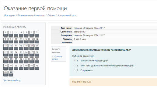 Тест выполнен на 100% верно. Обратите внимание, что порядок вариантов ответов может быть изменён. Какая повязка накладывается при повреждении лба? Выберите один ответ: 2. Бинт накладывается на лоб и фиксируется пластырем 3. Спиральная Как следует расположить руки на грудной клетке пострадавшего при выполнении непрямого массажа сердца? Выберите один ответ: 1.Основания ладоней обеих рук должны располагаться на грудной клетке на два пальца выше мечевидного отростка так, чтобы большой палец одной руки указывал в сторону левого плеча пострадавшего, а другой – в сторону правого плеча 2...
