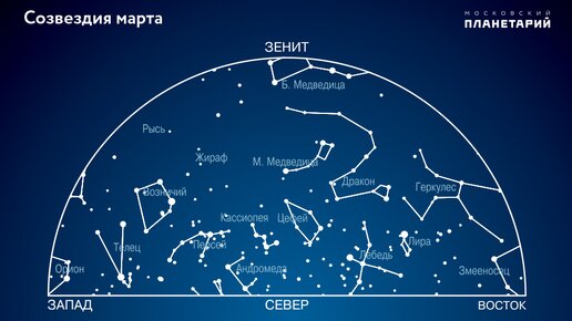 С вечера в юго-западной части неба видны зимние созвездия, которые постепенно склоняются к горизонту, уступая место созвездиям весеннего неба. На востоке восходит Змееносец, над ним расположено созвездие Геркулес, а выше его виден узнаваемый астеризм Голова Дракона. В северо-восточной области неба поднимается Лира, вблизи горизонта находится Лебедь.
