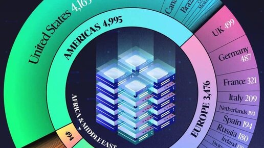 Дата-центры представляют собой становый хребт цифровой экономики — они хранят, обрабатывают и управляют всеми мировыми данными. На инфографике выше представлены страны с наибольшим количеством дата-центров по состоянию на ноябрь 2025 года, что позволяет увидеть, где сосредоточена мировая цифровая инфраструктура. США уверенно лидируют с 4165 дата-центрами, на которые приходится почти 38% всех объектов в мире. Это обусловлено мощным технологическим сектором страны — такие гиганты, как Amazon, Google и Microsoft, создали здесь разветвленную облачную инфраструктуру...