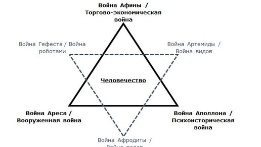 Предлагаю немного похулиганить, поиграть символами, формой и смыслами. Большую часть истории цивилизации определяющими были три вида противостояния: военная (Арес), торгово-экономическая (Афины) и психоисторическая (Аполлон) войны. Все это время основной линией, трендом развития человечества было создание новых технологий, что влекло рост численности и плотности населения, а далее приводило к появлению более сложных форм общественных отношений, т.е. усложнению общественного сознания. В 21-ом веке...
