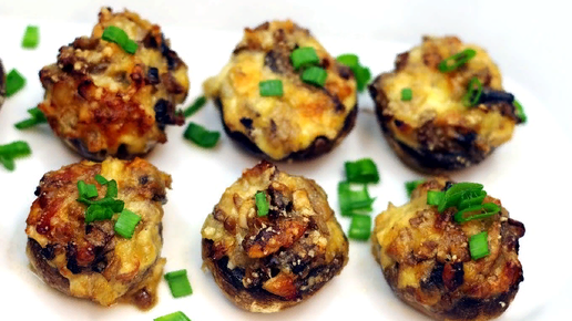 Это блюдо хорошо подходит в качестве закуски для вечеринок или гарнира к обеду. Грибы фаршируются массой из грибов, лука, копченой курицы, запекаются, после чего посыпаются пармезаном.