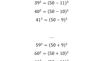 Здравствуйте! Сегодня мы разберемся, как без калькулятора и вычислений в столбик возвести в квадрат числа от 39 до 61! Как ни странно, для этого нам понадобится вспомнить формулу квадрата суммы: