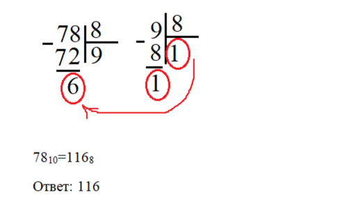 Примечание: 1) При переводе числа из десятичной системы счисления в двоичную, восьмеричную, 16-теричную системы счисления, делим это число на основание системы (2, 8, 16), обводим остатки, записываем полученное число, начиная с последнего ответа (см. решение). 2) задание выполняли так: 78 делим на 8, берем по 9, остаток 6 обводим; 9 делим на 8 , берём по 1, остаток 1 обводим; 1 на 8 нацело не делится, значит, деление закончено. Записываем полученное число, начиная с последней 1. Чтобы перевести...