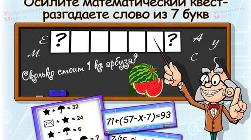Здравствуйте, дорогие подписчики и гости канала! Сегодня вас ждёт увлекательный комплексный тест, в котором необходимо решить примеры, поразмышлять над задачкой, разгадать буквы и составить слово. Тест состоит из 7 математических заданий, которые желательно выполнять в уме. За каждый верный ответ будет открываться одна из букв зашифрованного слова. Вероятность разгадать слово увеличивается с каждым верным ответом. Ответ в виде числа необходимо вписать в специальное поле под карточкой/картинкой с заданием...